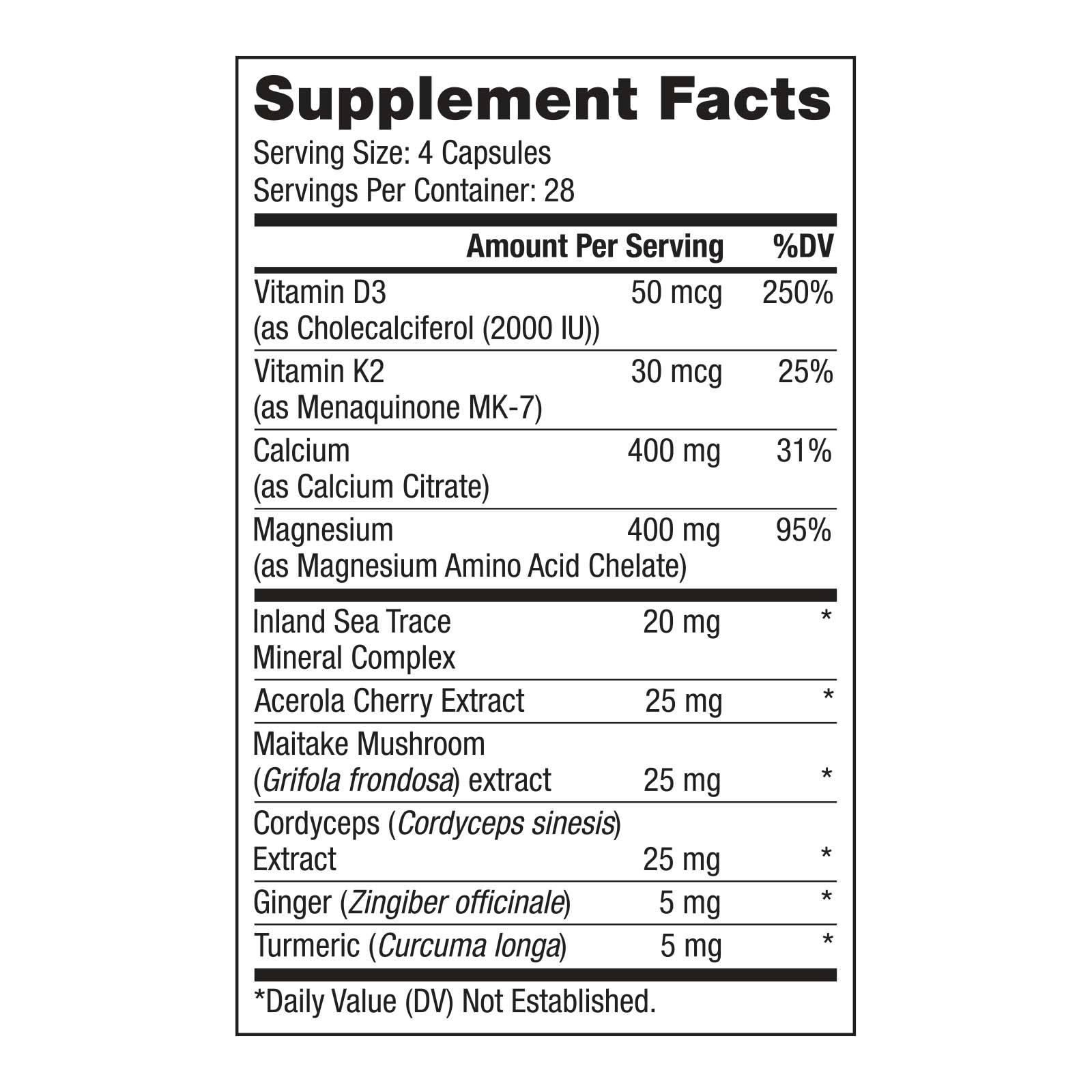 Calcium (Calcium Citrate), Vitamin D3 (as Cholecalciferol (2000 IU)), Vitamin K2 (as Menaquinone MK-7), Magnesium (as Magnesium Amino Acid Chelate), Inland Sea Trace Mineral Complex, Acerola Cherry, Maitake Mushroom (Grifola frondosa) extract, Cordyceps (Cordyceps sinesis) Extract, Ginger (Zingiber officinale), Turmeric (Curcuma longa)