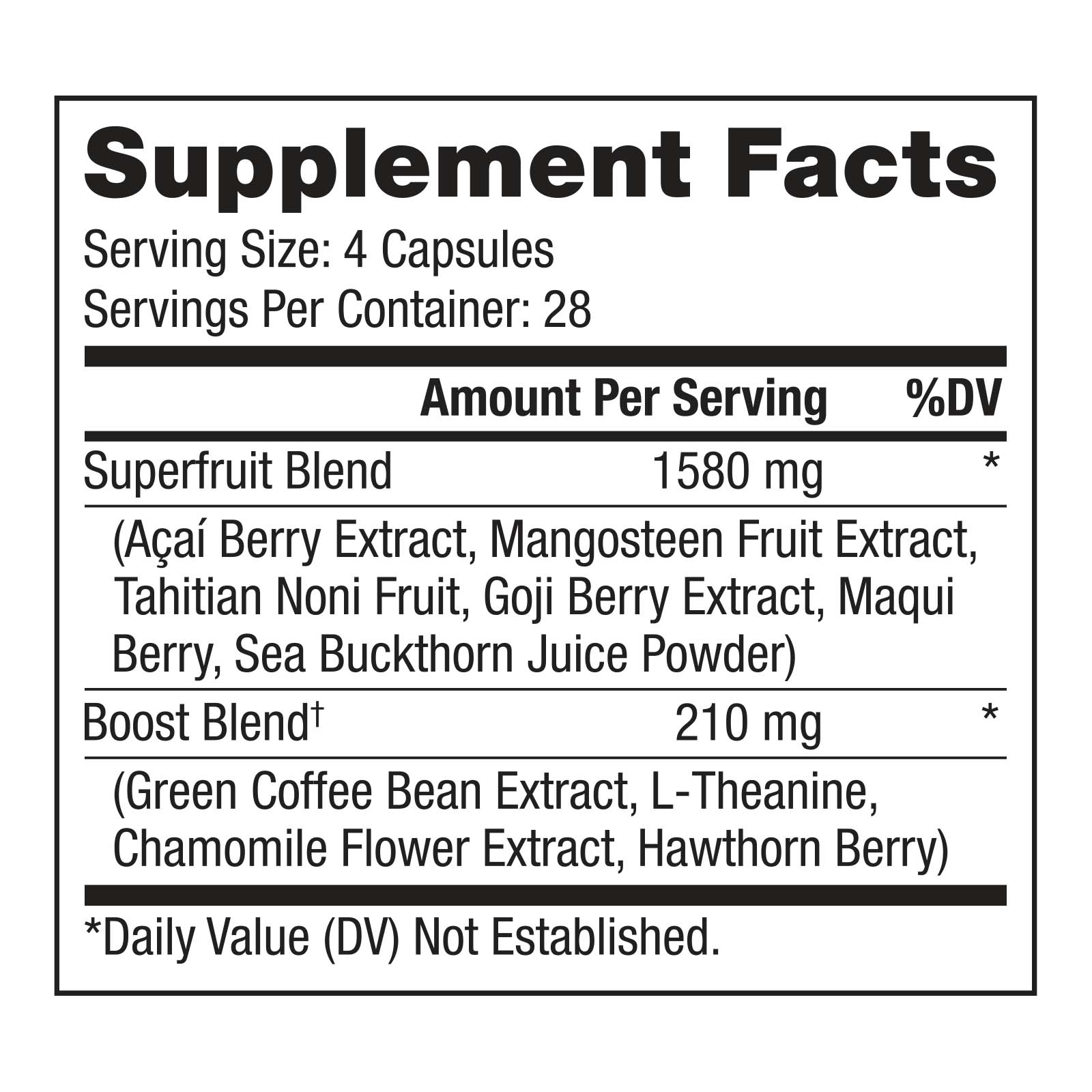 Superfruit Blend (Acai Berry Extract, Green Coffee Bean Extract, L-theanine, Chamomile Flower Extract, Noni Fruit Powder, Mangosteen Fruit Extract, Goji Berry Extract, Maqui Berry, Sea Buckthorn Juice Powder), Boost Blend (Green Coffee Bean Extract, L-theanine, Chamomile Flower Extract, Hawthorn Berry).